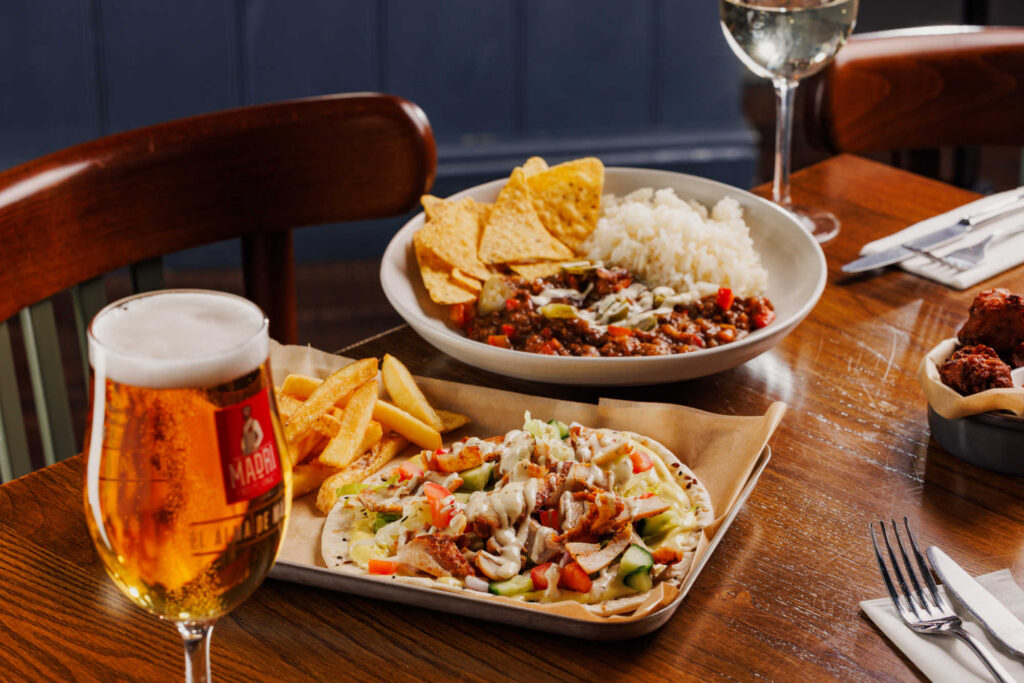 Chicken gyros, shredded seasoned chicken, fresh salad, garlic mayo on a Turkish-style flatbread, served with chips | 11.99 826 kcals
