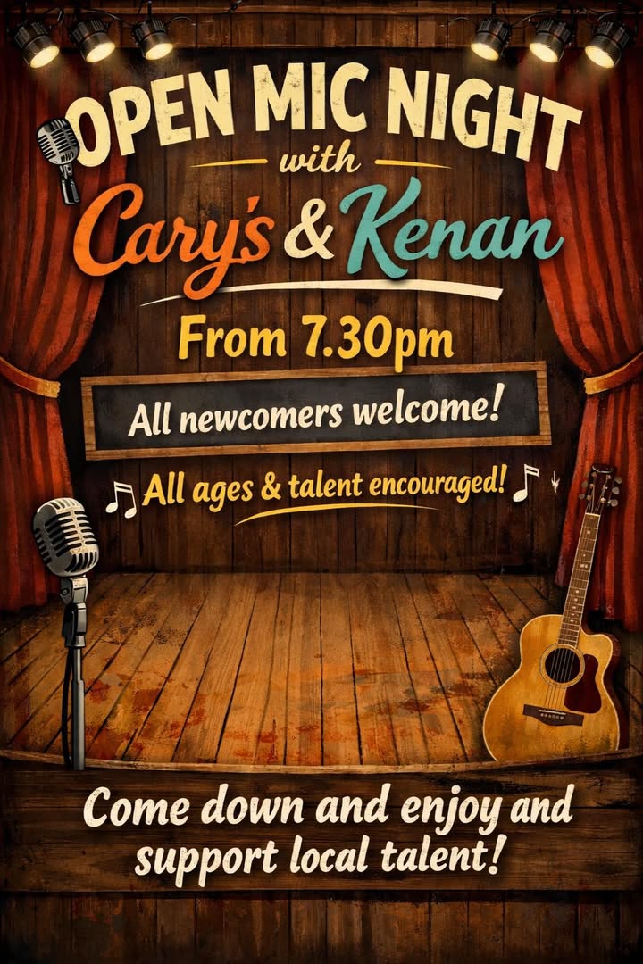 🎤 Open Mic Night Tonight! 🎶 Don’t forget, from 7:30pm Cary’s and Kenan are hosting another fantastic Open Mic Night! We’d love to see some new faces alongside our familiar favourites — all ages and talents are welcome, and newcomers are always encouraged to get up and have a go. And of course… free chip butties as always! 😋 Come down, enjoy the atmosphere, and support some amazing local talent. See you tonight!