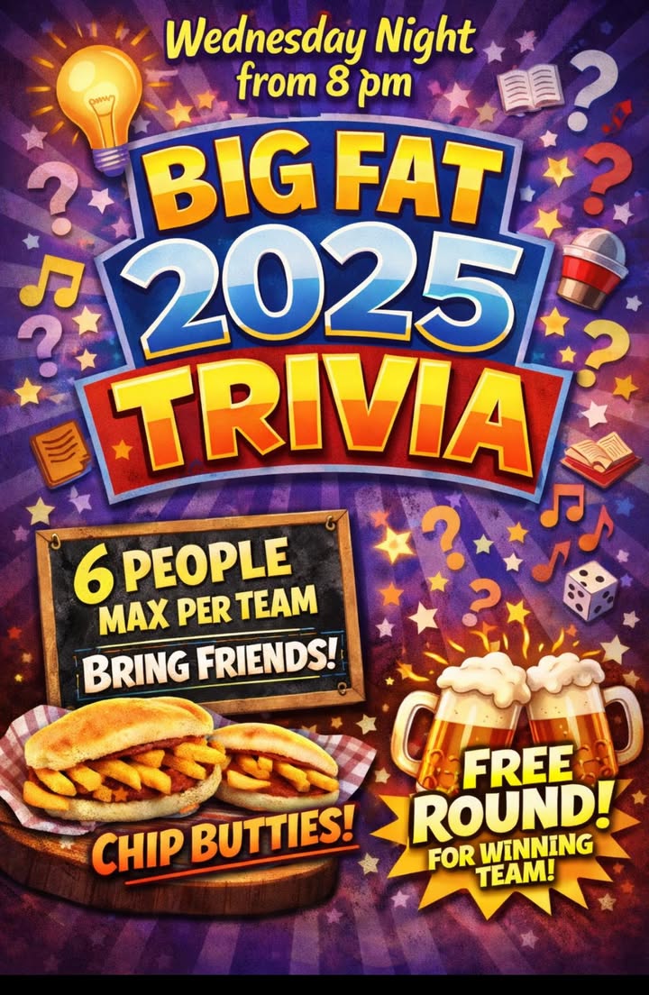 It’s quiz night again this Wednesday from 8pm 🎉 The Big Fat 2025 Trivia Quiz with Brian Chip butties at the interval 🍟 Free round for the winning team 🍻 Teams of up to 6 Grab your mates and come test your knowledge 🧠🧠
