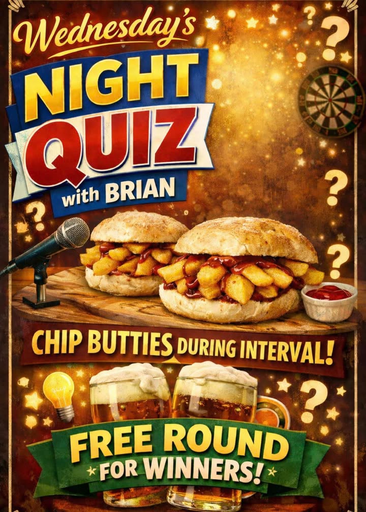 It’s quiz o’clock! 🧠🍻 Tonight from 8pm Quiz night with Brian — round up your pals, drag the family out, and give those brain cells a proper workout (no Googling, we see you 👀). 🥪 Chip butties during the interval 🍺 Free round for the winning team (max 6 clever clogs) Midweek boredom? Not on our watch. Come for the quiz, stay for the laughs, leave arguing about the answers 🤣